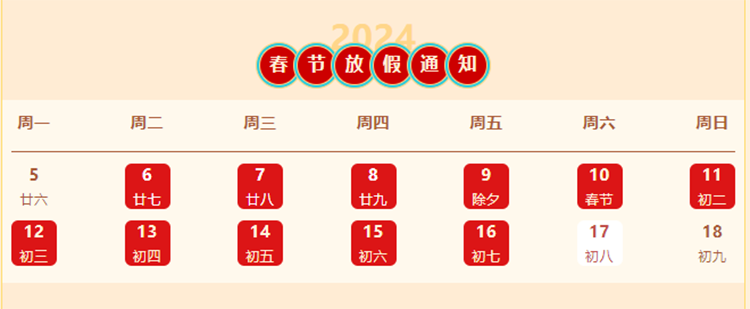 一、春節(jié)假期:2024年2月6日(臘月二十七)至2024年2月16日(正月初七),共計11天,2024年2月17日(農歷正月初八)正式上班。